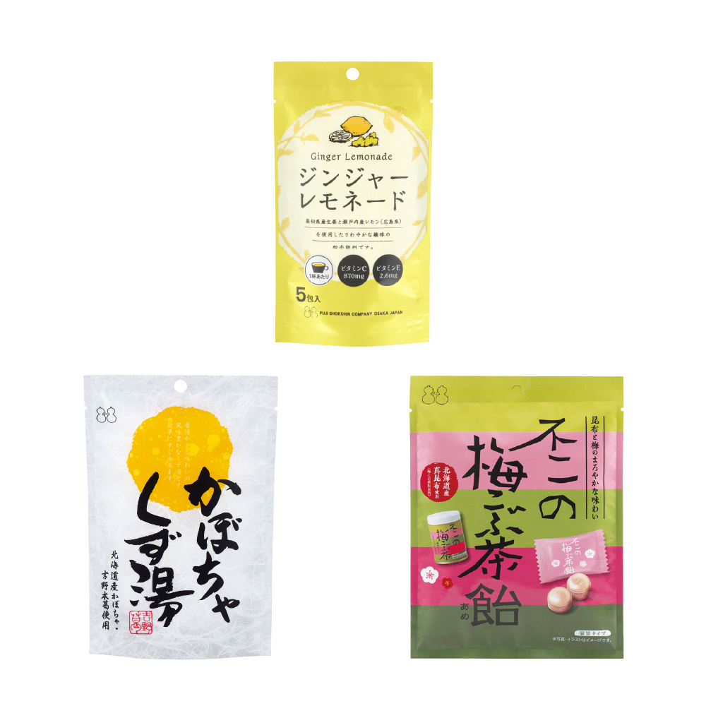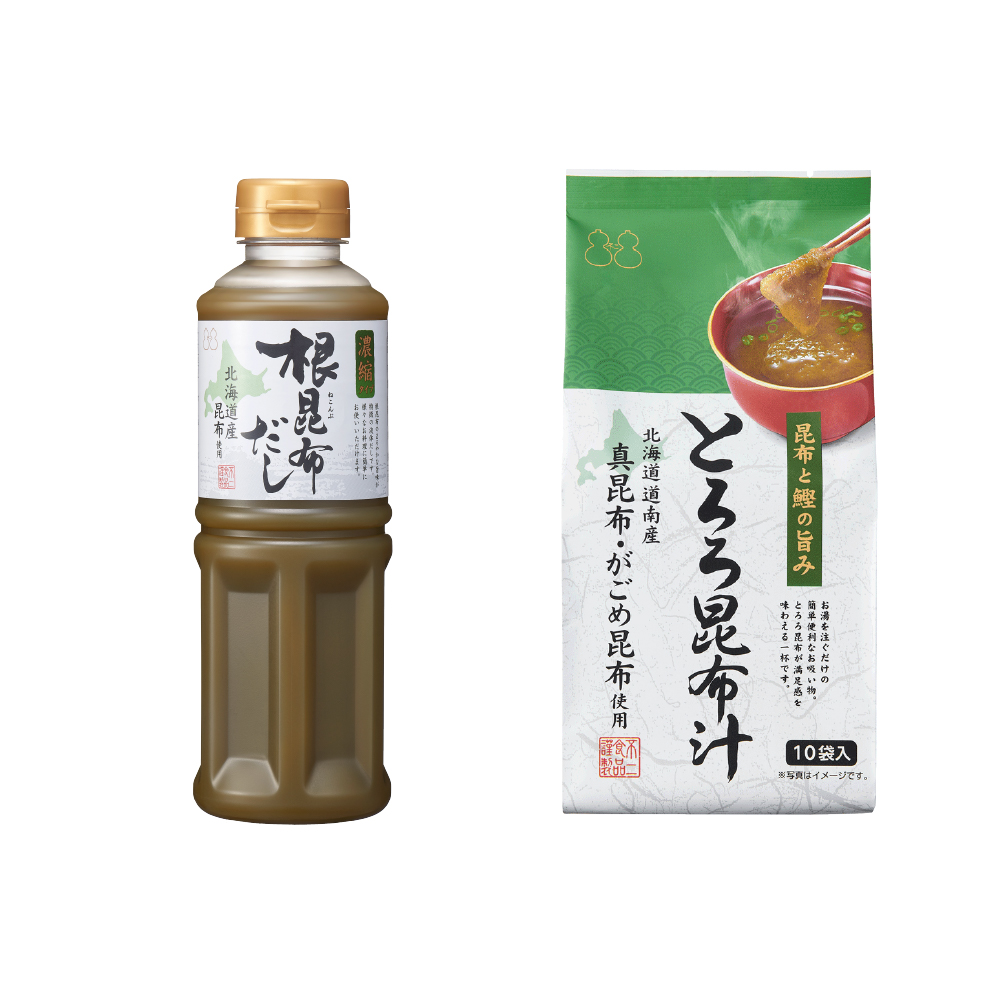粉末飲料、くず湯、お吸い物、液体根昆布だし、キャンディー、オリジナルグッズなど、